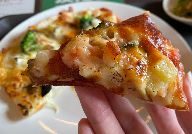 米粉のピザ生地は、薄めでもちっとした食感です。