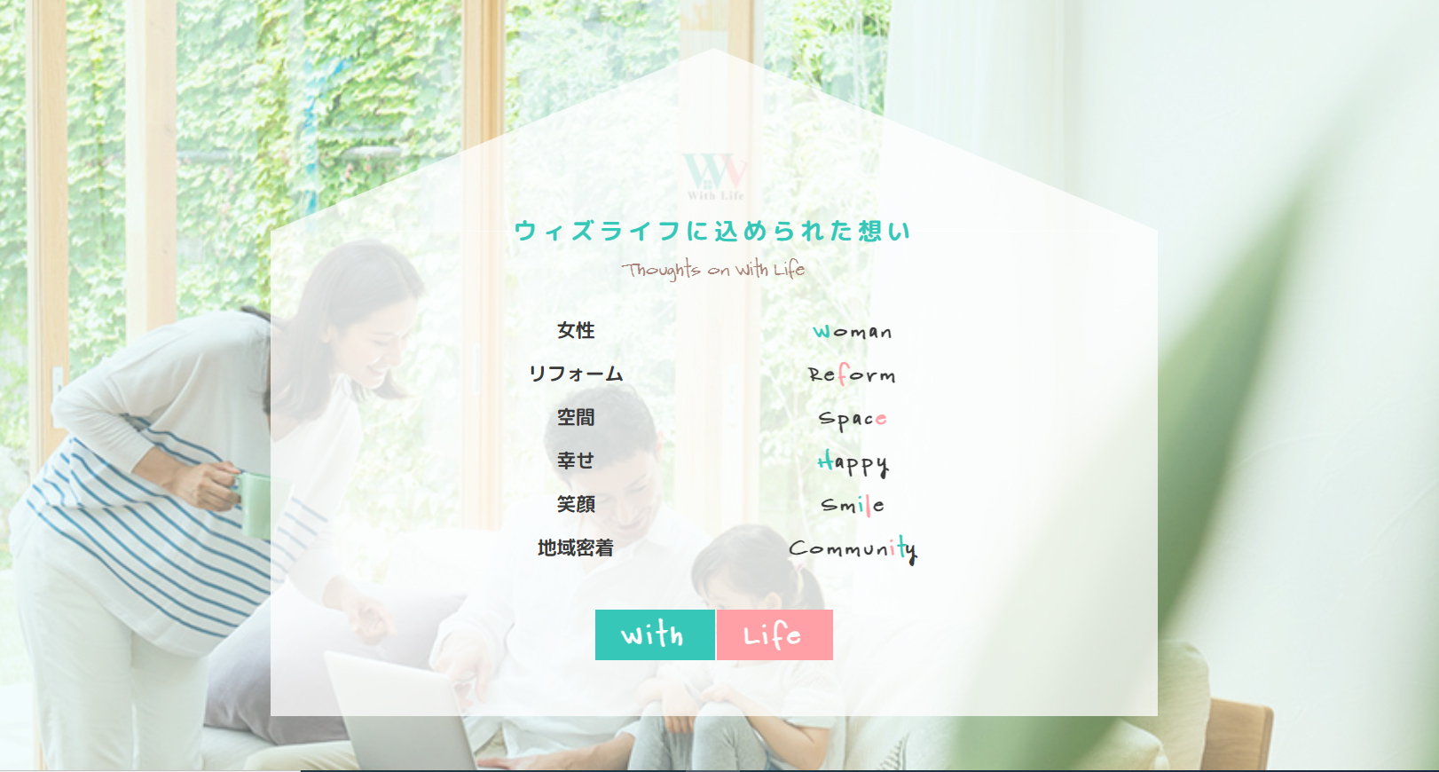 この『withlife』という名前にはお客様への様々な想いを含めて決めました。 お客様おひとりおひとりのお家にも様々な想いが詰まっていると思います。その想いの詰まったお家 を私たちウィズライフでは、女性目線・男性目線の両方から、安心・安全で快適なリフォーム工事をご提案させて頂いております。