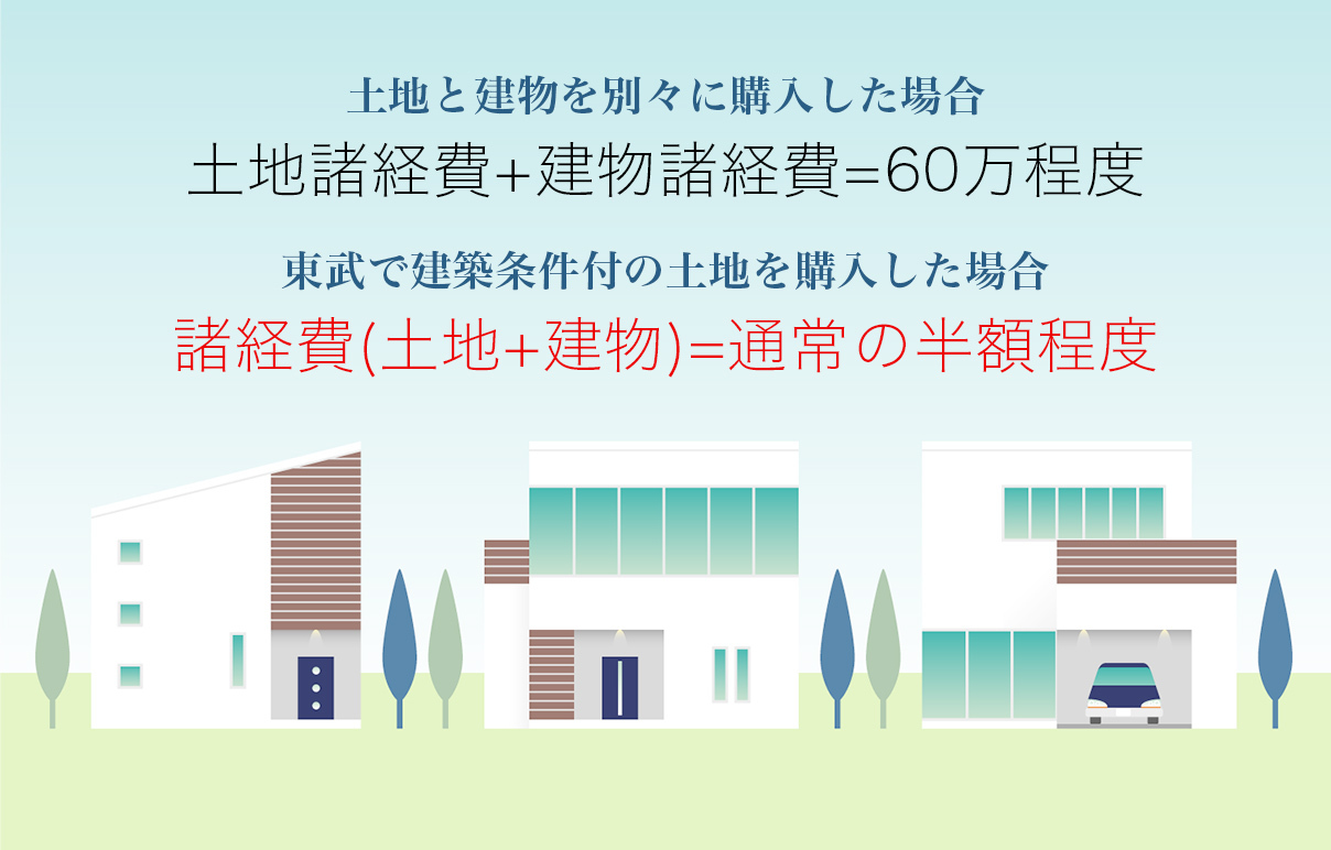 通常、家を建てる際の諸々の手続きは60万程度かかってしまいます。しかし、東武ニューハウスの「建築条件付(当社で建築するという条件付)」の土地の場合、諸経費がその半額に!!!