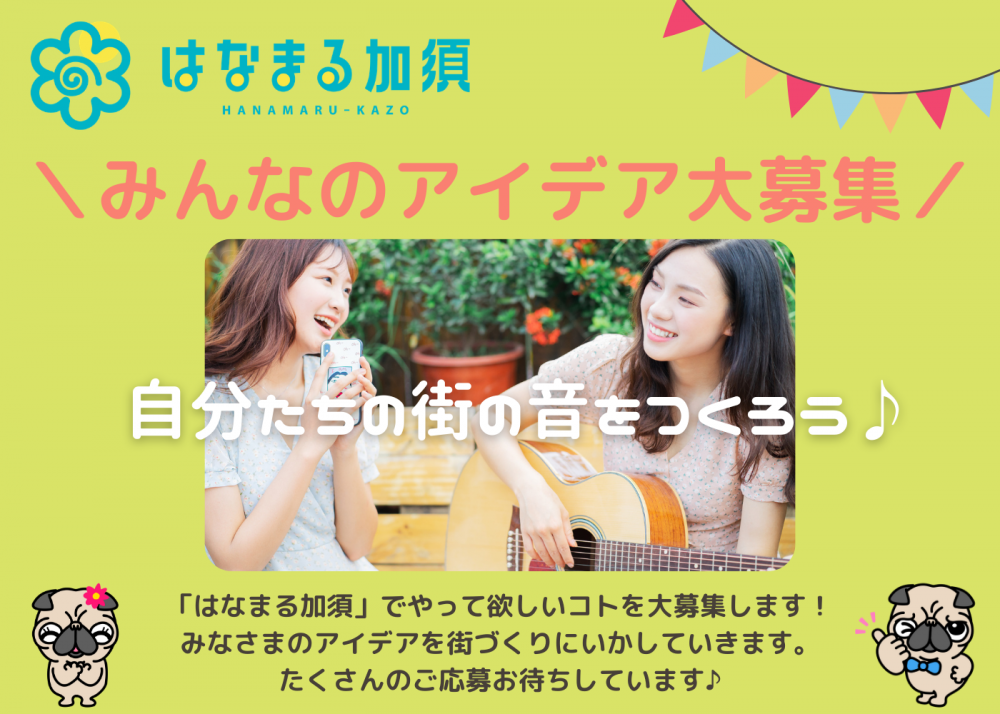加須地域のバーチャルタウン「はなまる加須」でやって欲しいコトを大募集します。 例えば、 「テイクアウトグルメ特集をやって欲しい」とか、 「加須版酒場放浪記で隠れた名店を取材してい欲しい」 「掲載店舗の動画活用セミナーを開催して欲しい」などなど。 みなさまからのアイデアを街づくりにいかしていきたいと思います。 ぜひ、一緒に「街の音をつくりましょう」 たくさんのアイデアのご応募お待ちしています♪