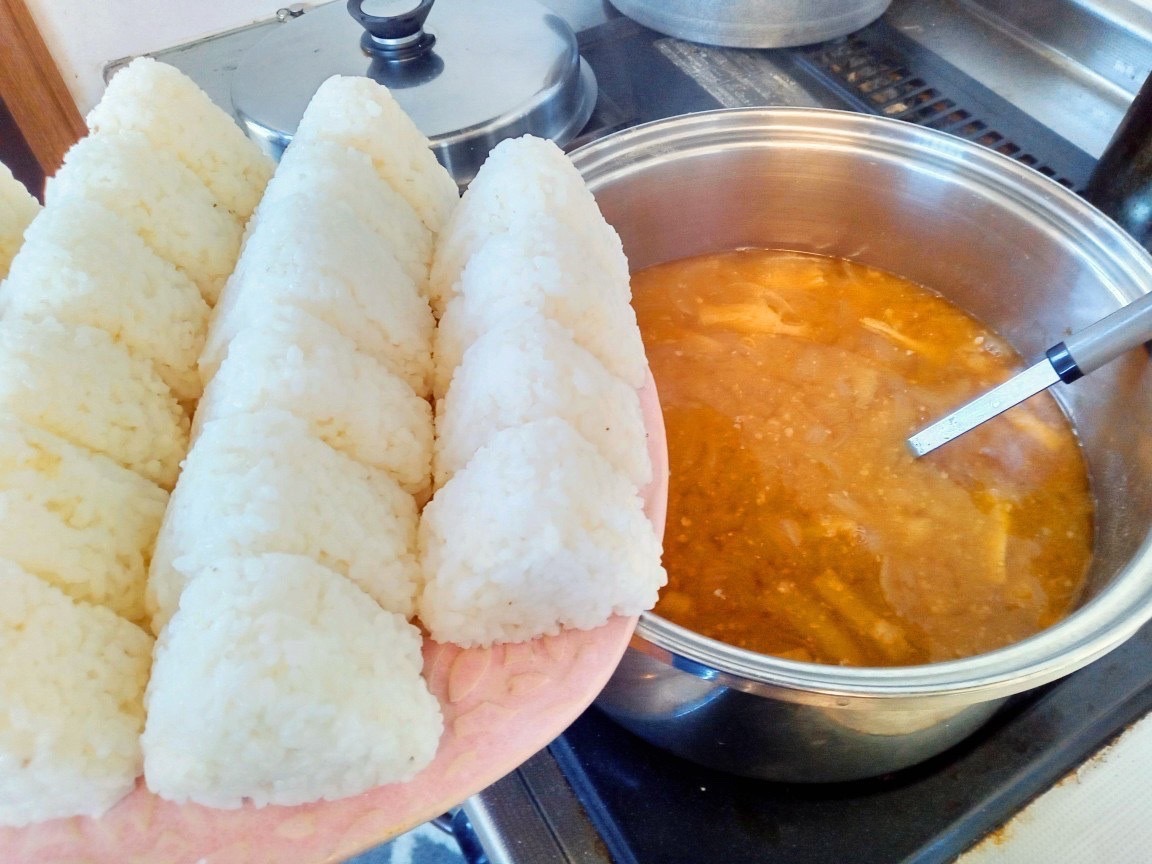 味噌は大豆の選別から味噌仕込みまで自分たちで作った味噌汁で、とっても美味しい!塩おむすびもお腹が空いている時には嬉しいー!