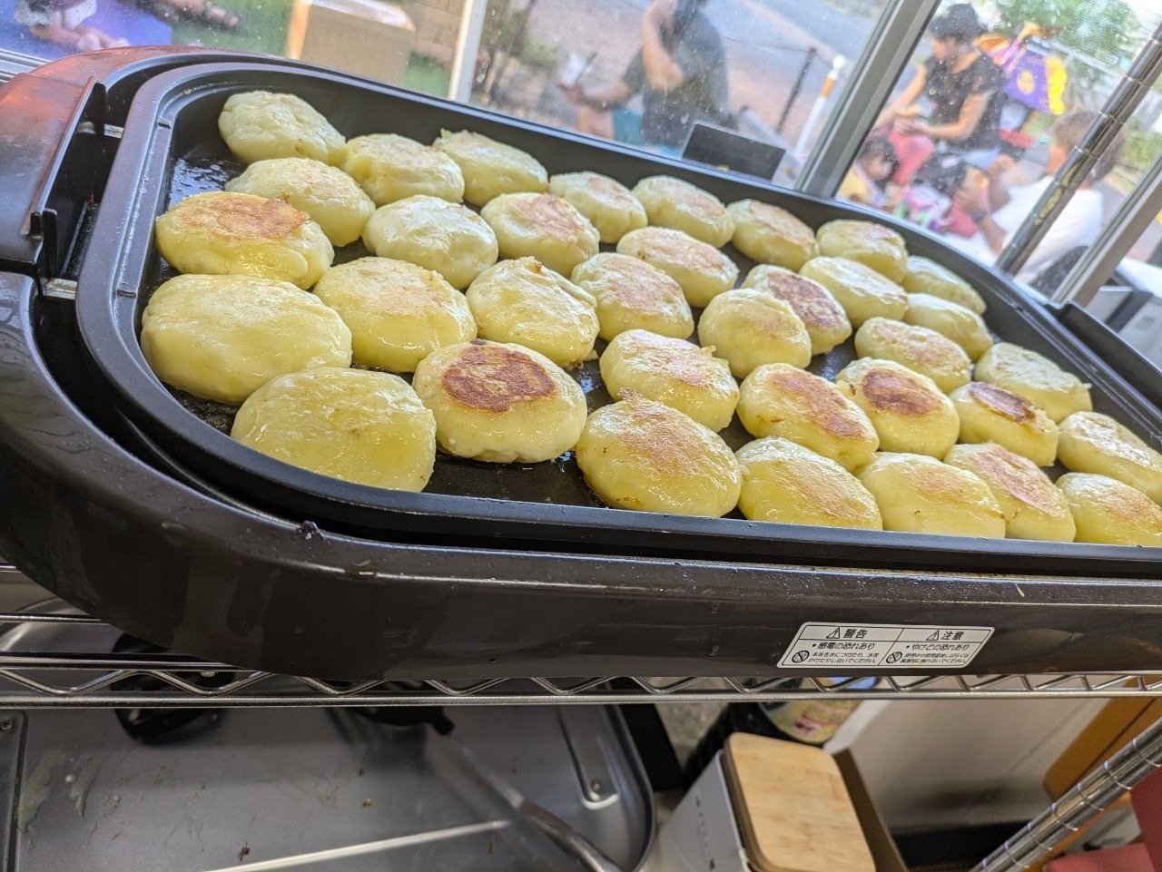 畑でみんなで育てて収穫したじゃがいもを茹でてつぶして丸めます。バター醤油とみりんで甘く焼いてくれます。チーズをのせても美味しいよ!