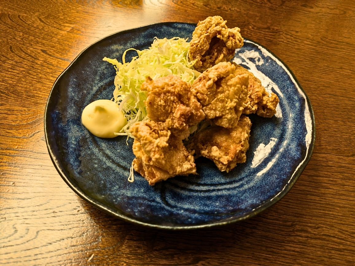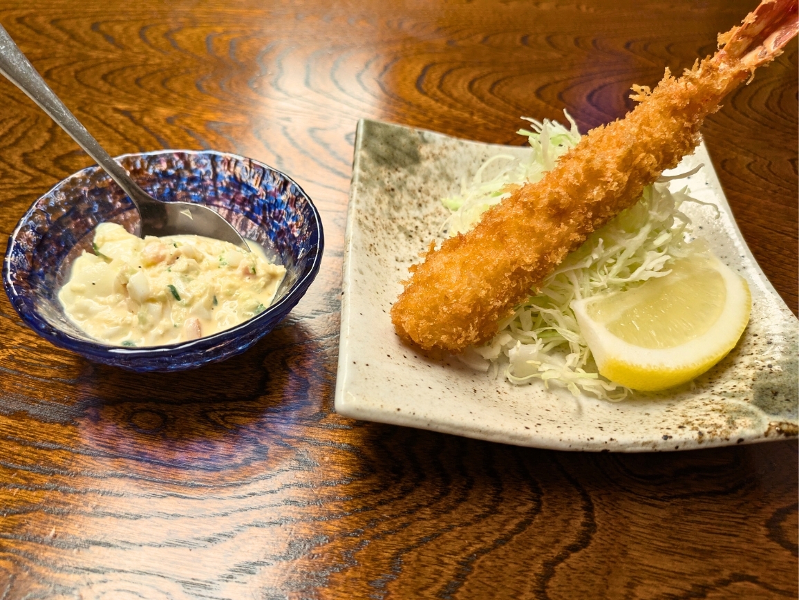 みんな大好きな鶏の唐揚げと1本からオーダーできるぷりぷりのエビフライも美味でした。