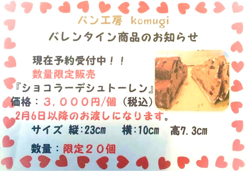 国産小麦を100%使用・無添加で、パンだけでなくラスクやクッキー、焼き菓子もある、可愛くてほっとする空間の<パン工房 komugi>のバレンタイン限定シュトーレン。