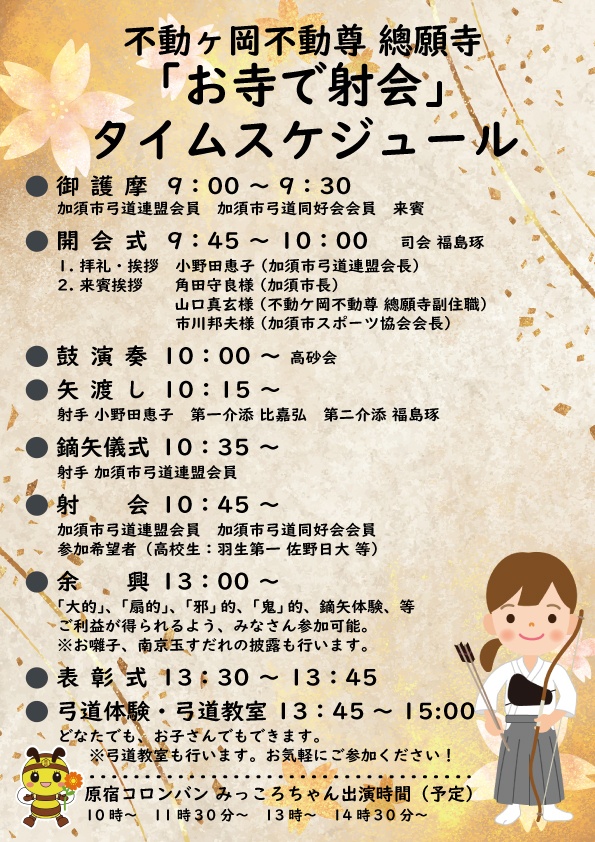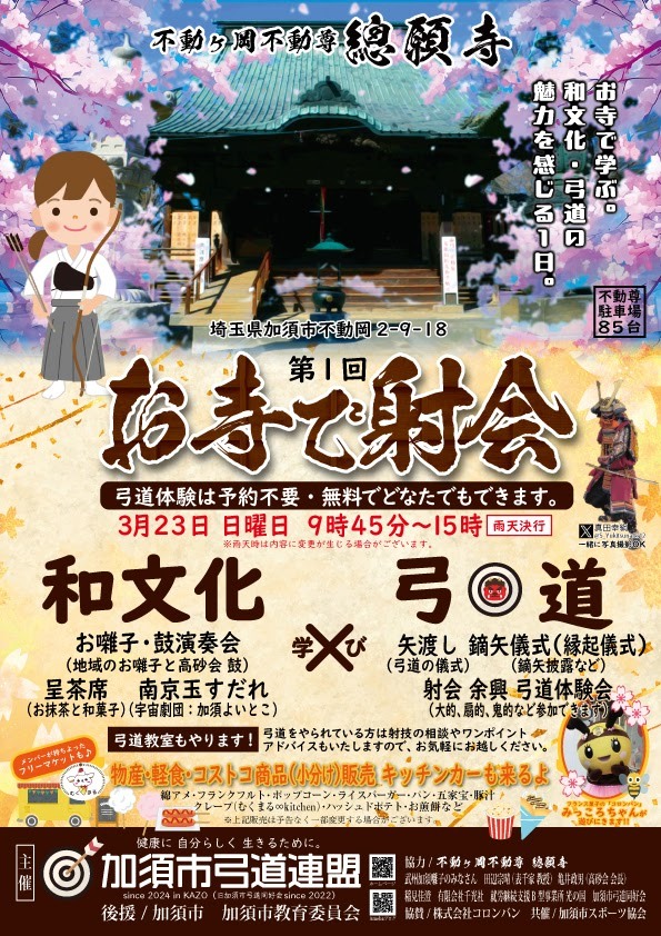 今回は2025年3月23日(日)に加須市にある不動ヶ岡不動尊 總願寺で行われた加須市弓道連盟主催のイベント「お寺で射会」を取材してきたぞ!