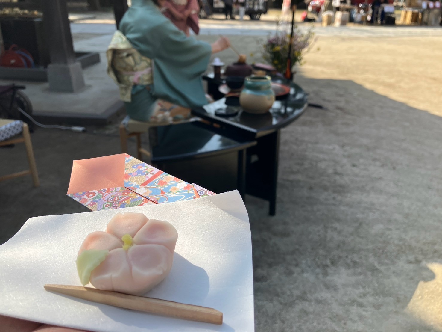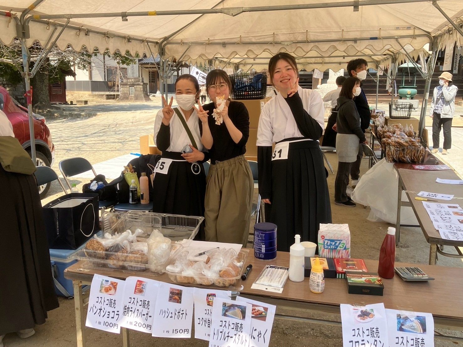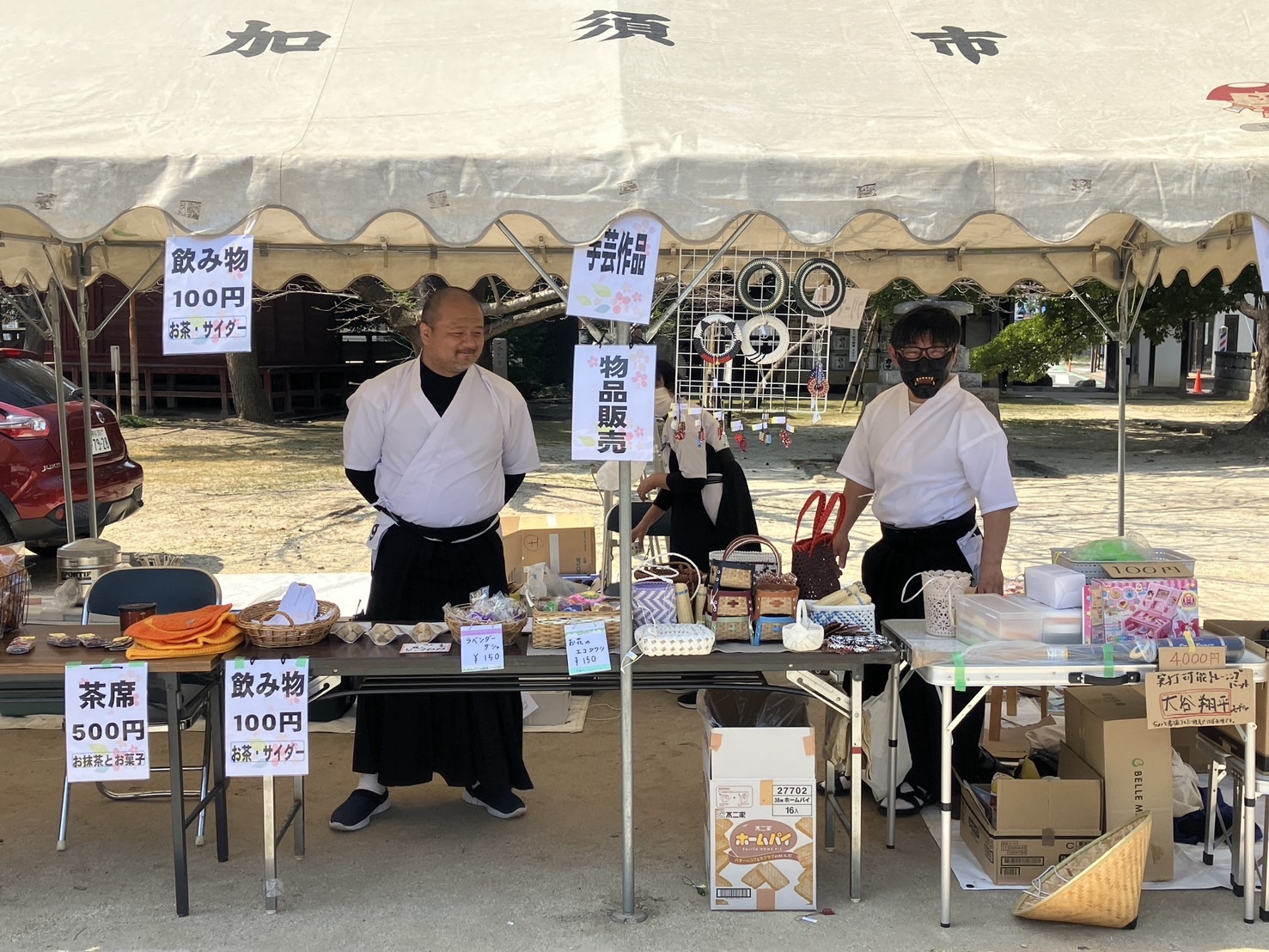 今回のイベントでは連盟員で持ち寄った品のフリーマーケットや、手作り品、軽食、コストコ商品の小分け販売、呈茶席(抹茶と和菓子)、光の国さんのおせんべい、武蔵屋本店さんの五家宝販売なども行われました。・呈茶席