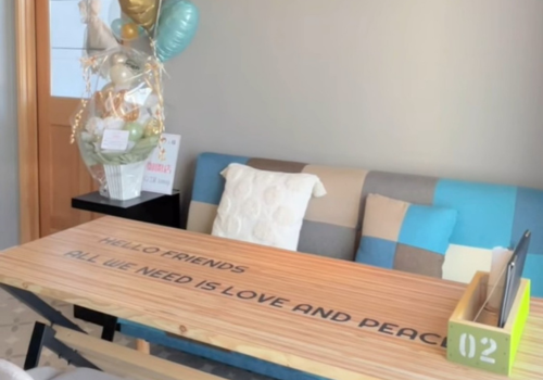 おしゃれなソファとオーナー手作りのテーブルが印象的。