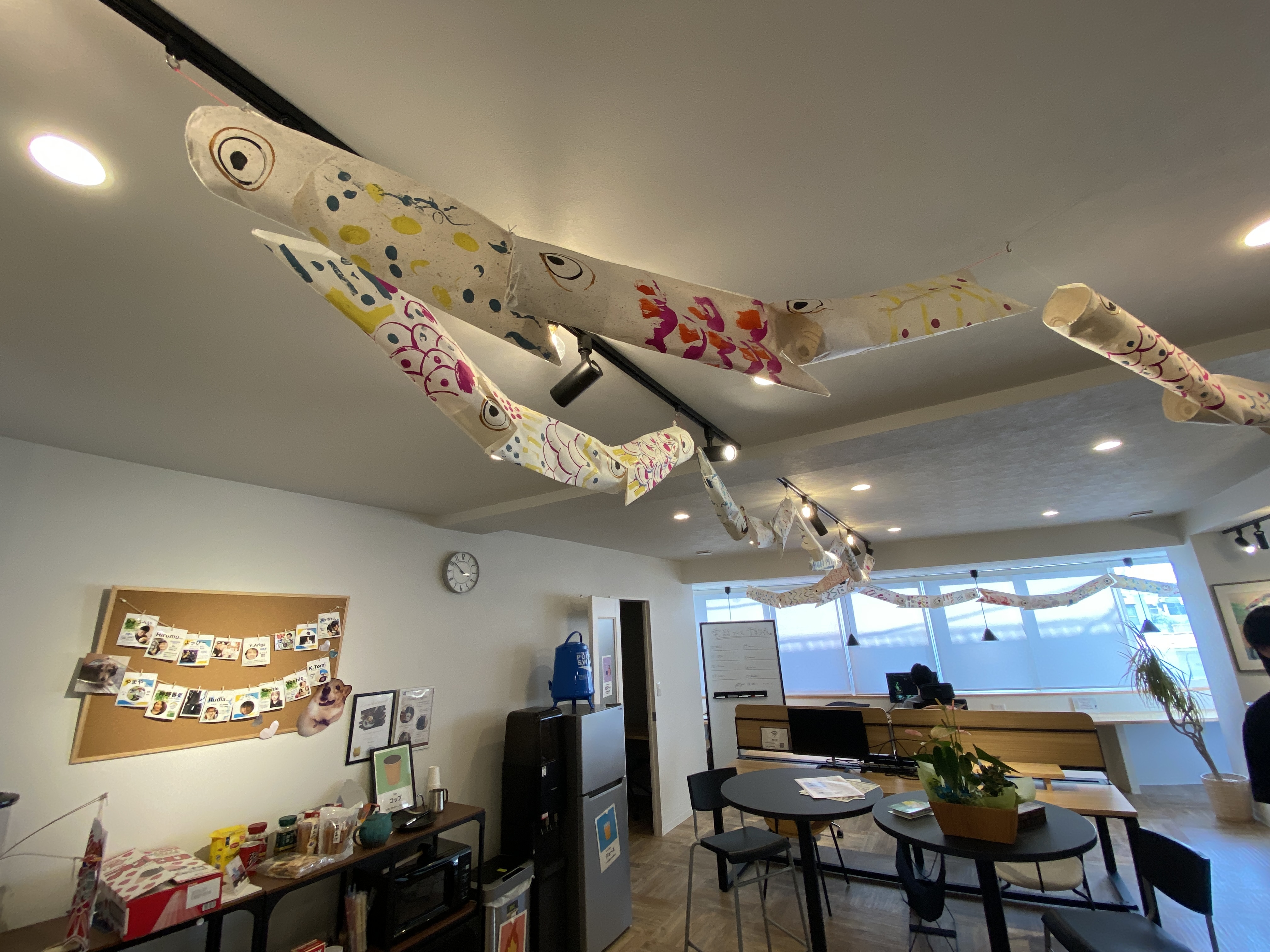 和紙製のこいのぼりは、2階コワーキングスペースに。