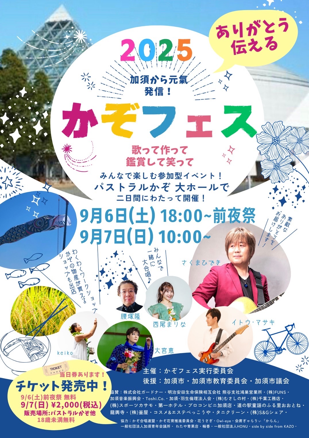 | 日時 | 9月6日(土)18:00〜 前夜祭(入場無料) 9月7日(日)10:00〜 かぞフェス |
