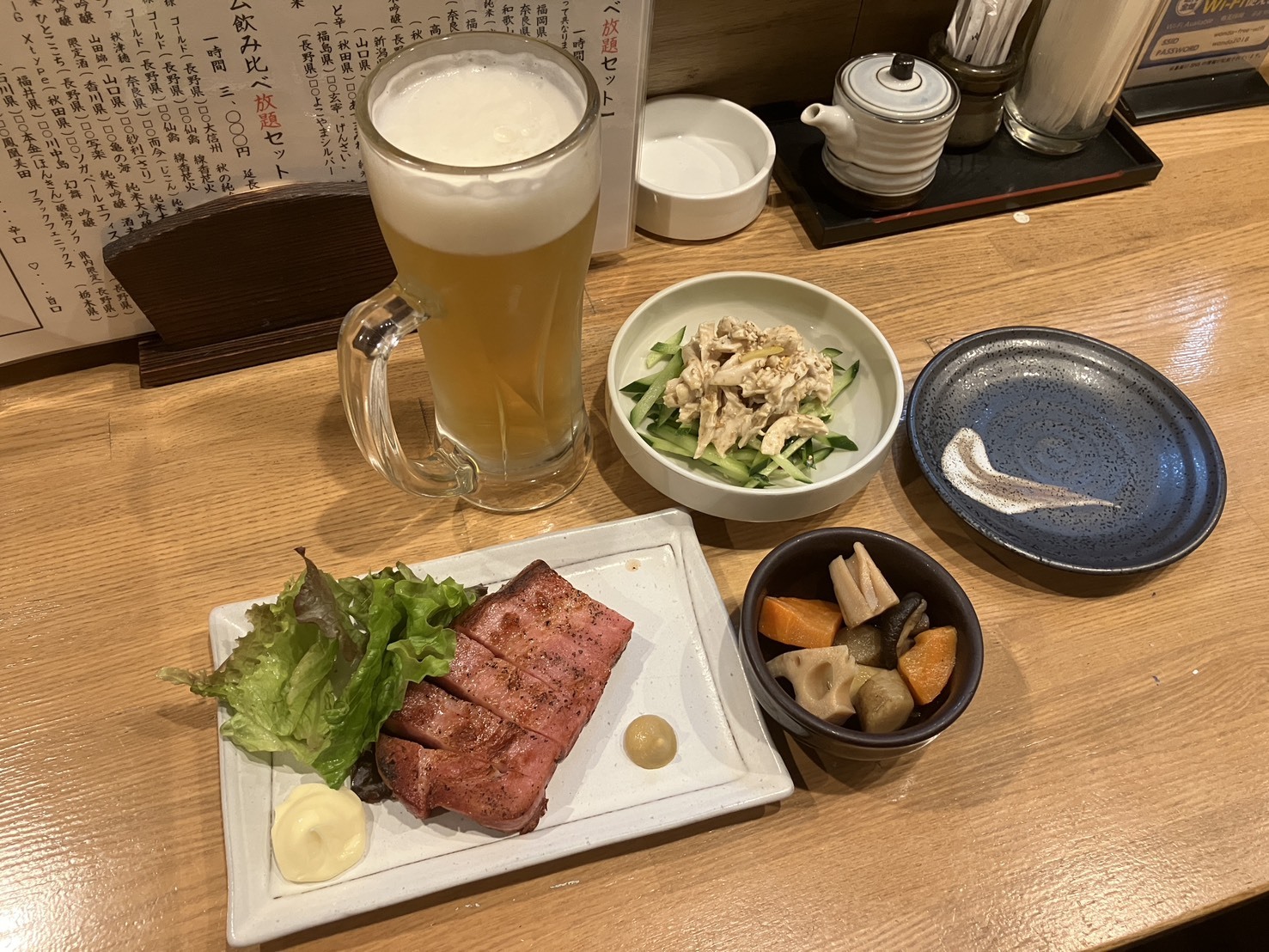 ひたすら悩んだ末、生ビール(中ジョッキ)1杯600円とお通しの煮物300円、鶏ささみの柚子ゴマ和え550円、厚切りベーコンの黒コショウ焼き550円の合計2000円(税抜)でチョイスし注文。