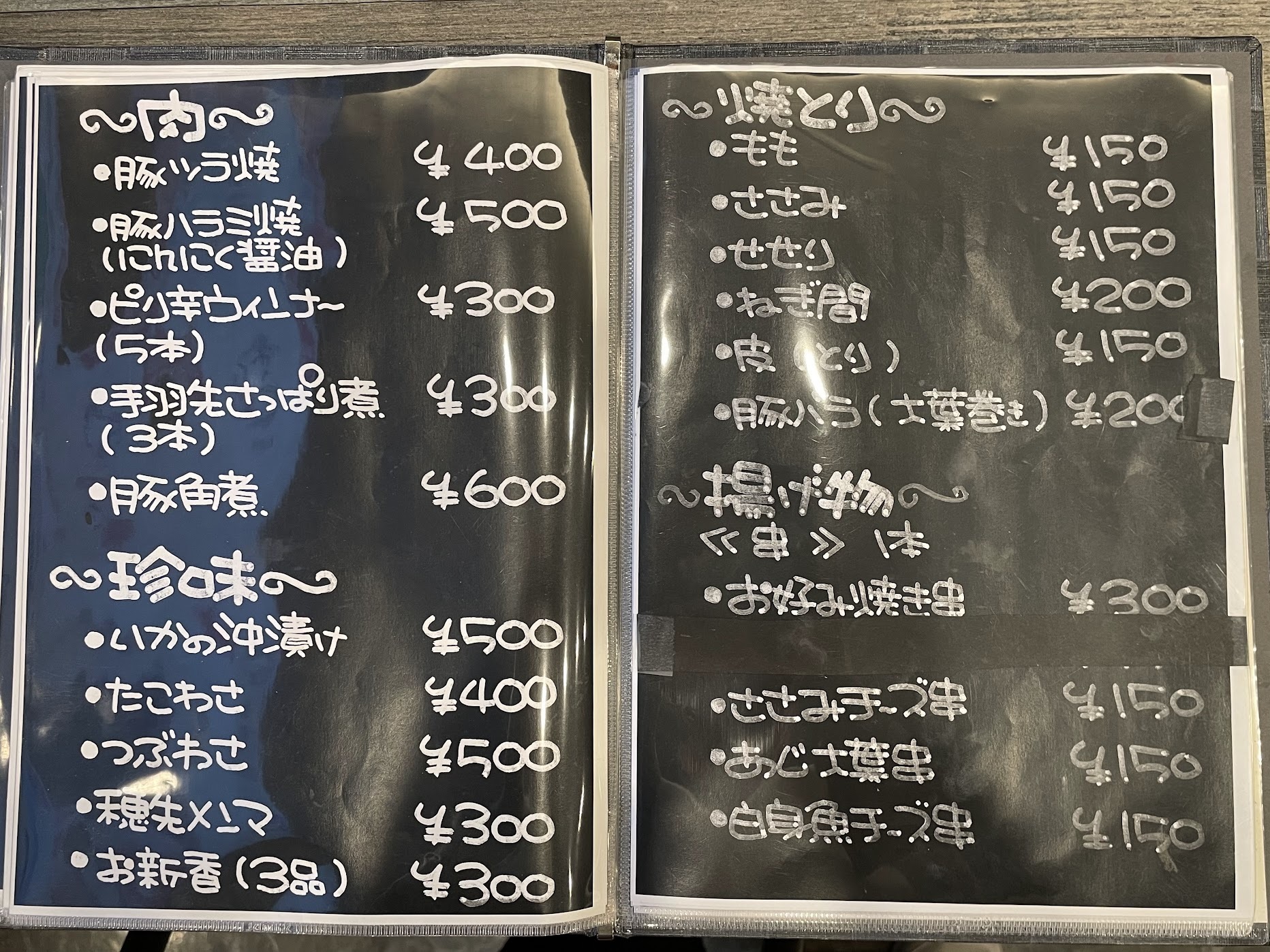 肉料理や珍味、焼きとりに揚げ物、麺やご飯ものまで、バラエティに富んだメニューが揃っています。