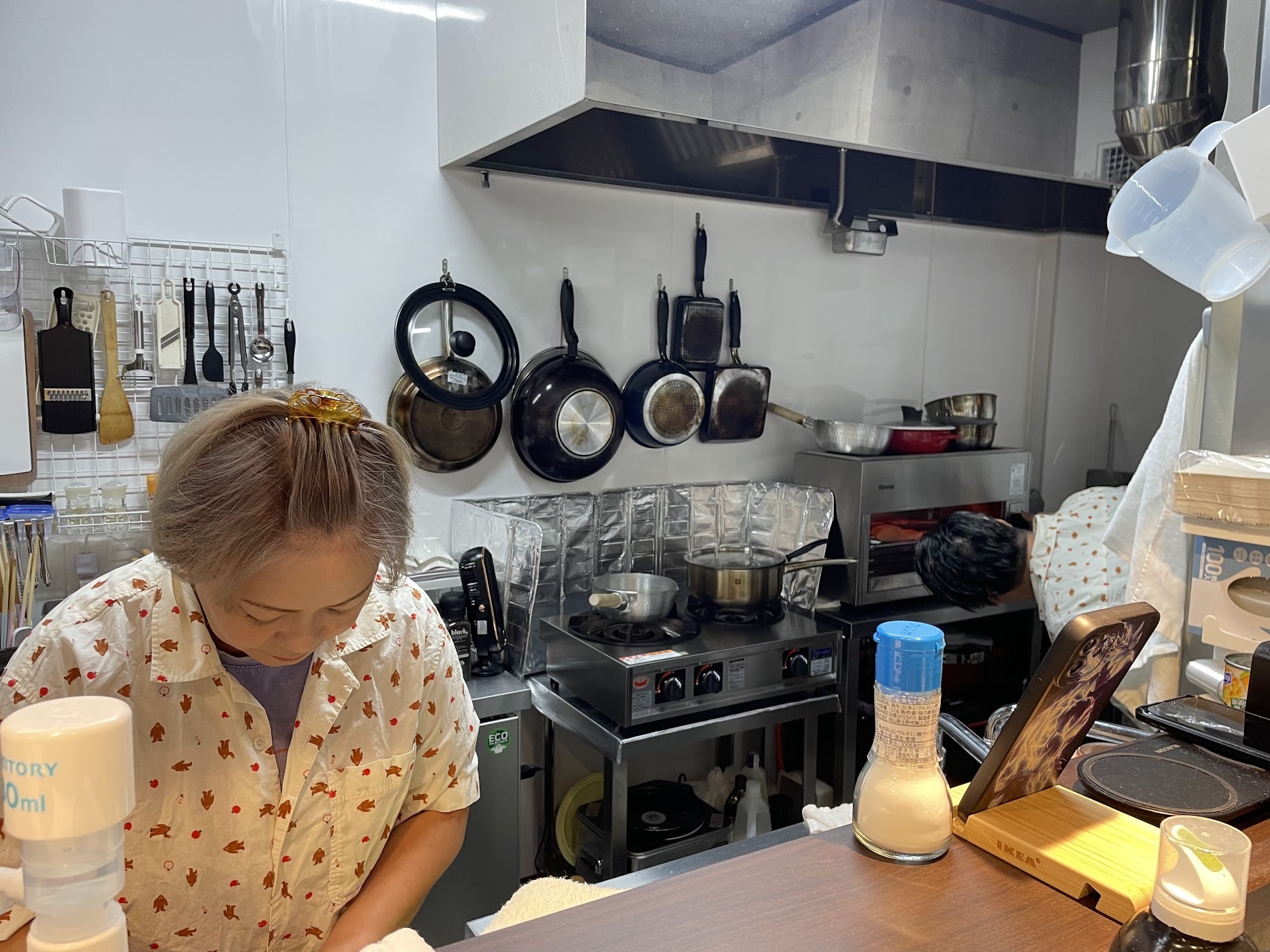 焼き鮭の具合をこまめに確認するマスターと料理を作るママ