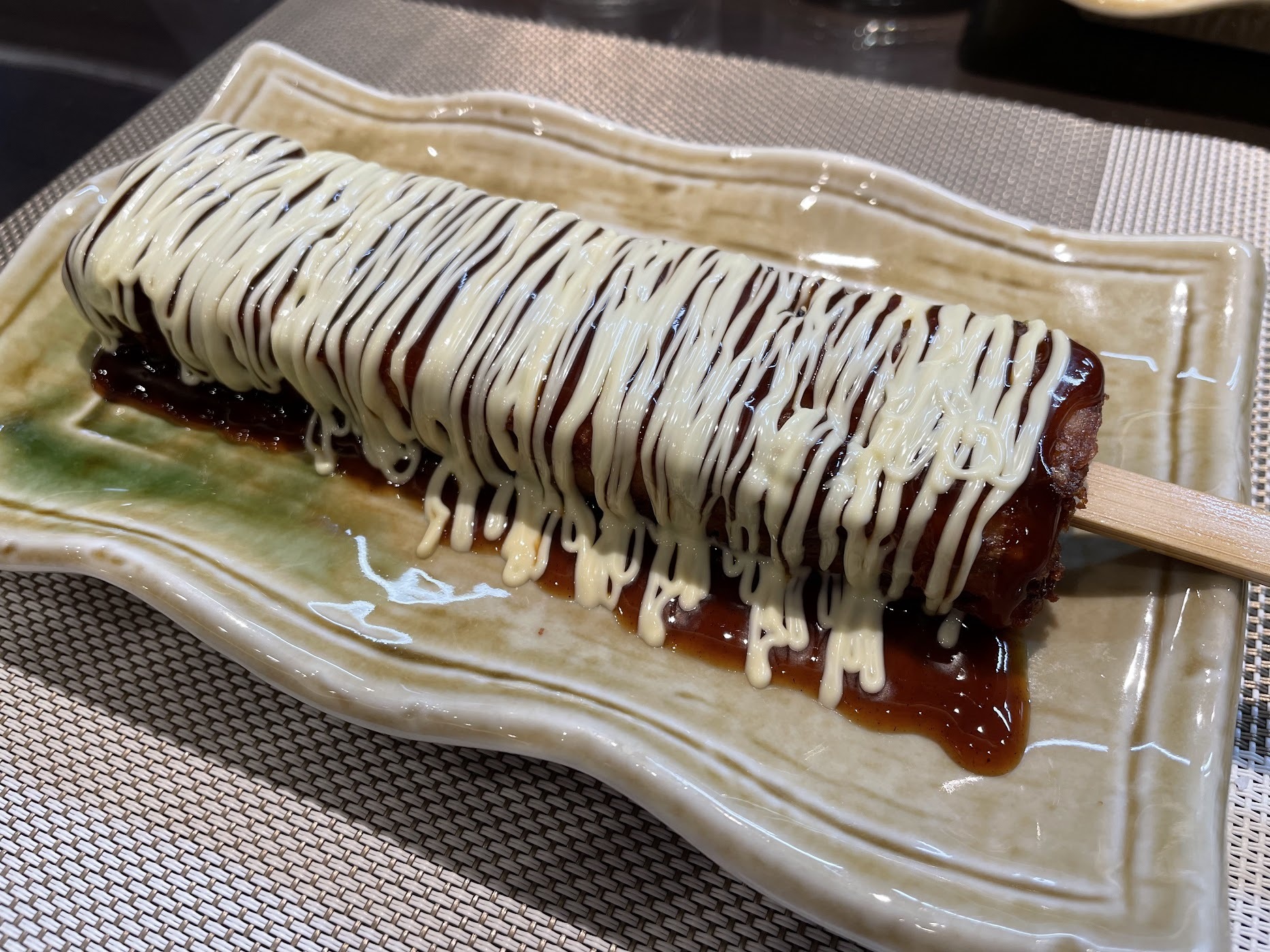「お好み焼き串」です。お好み焼きが串になっているなんて、面白いですねぇ。しかも、揚げてあるから外側がカリッ!中はフワッとした食感でとてもおいしい。