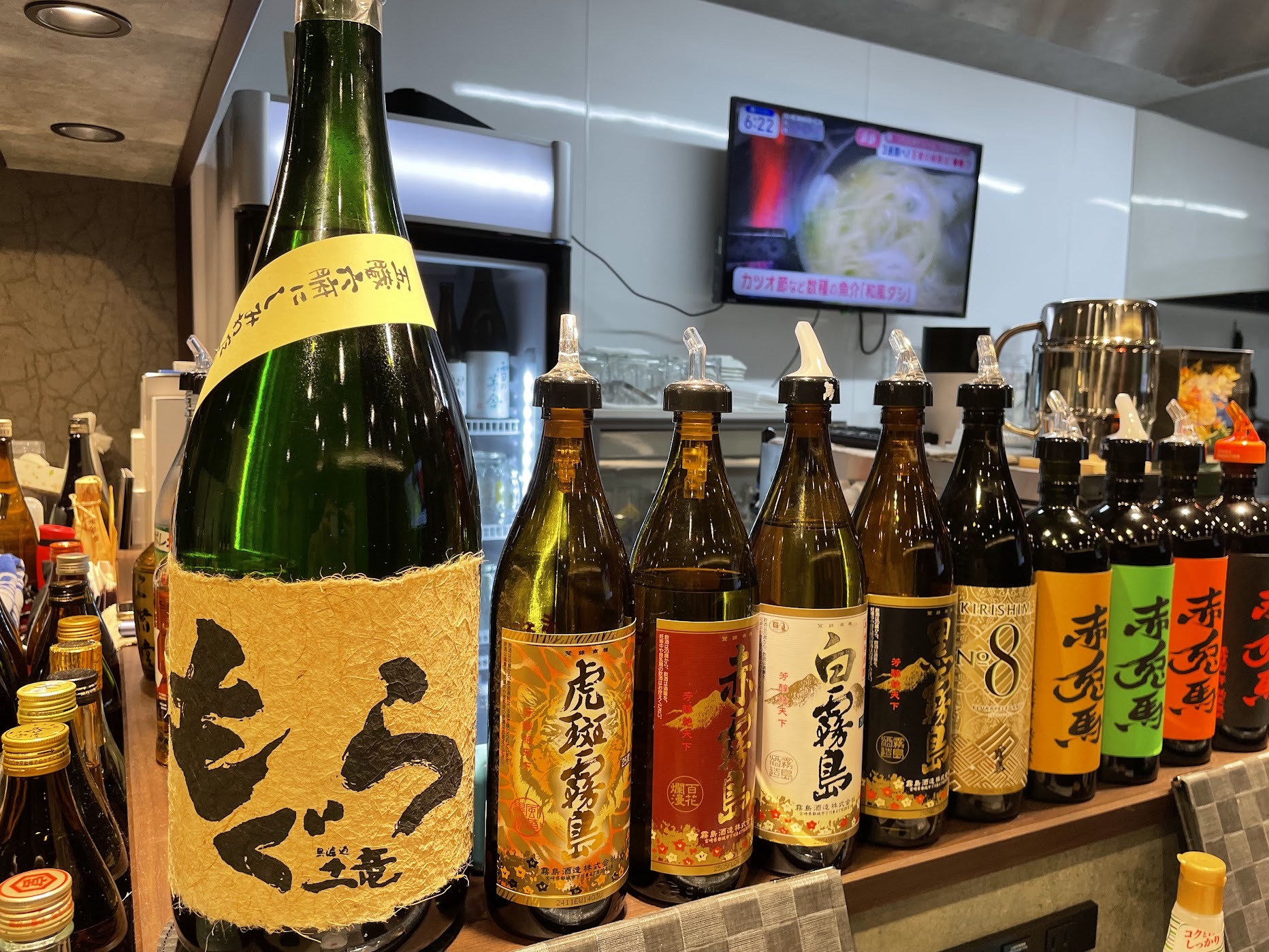 カウンター前には焼酎がずらり。
