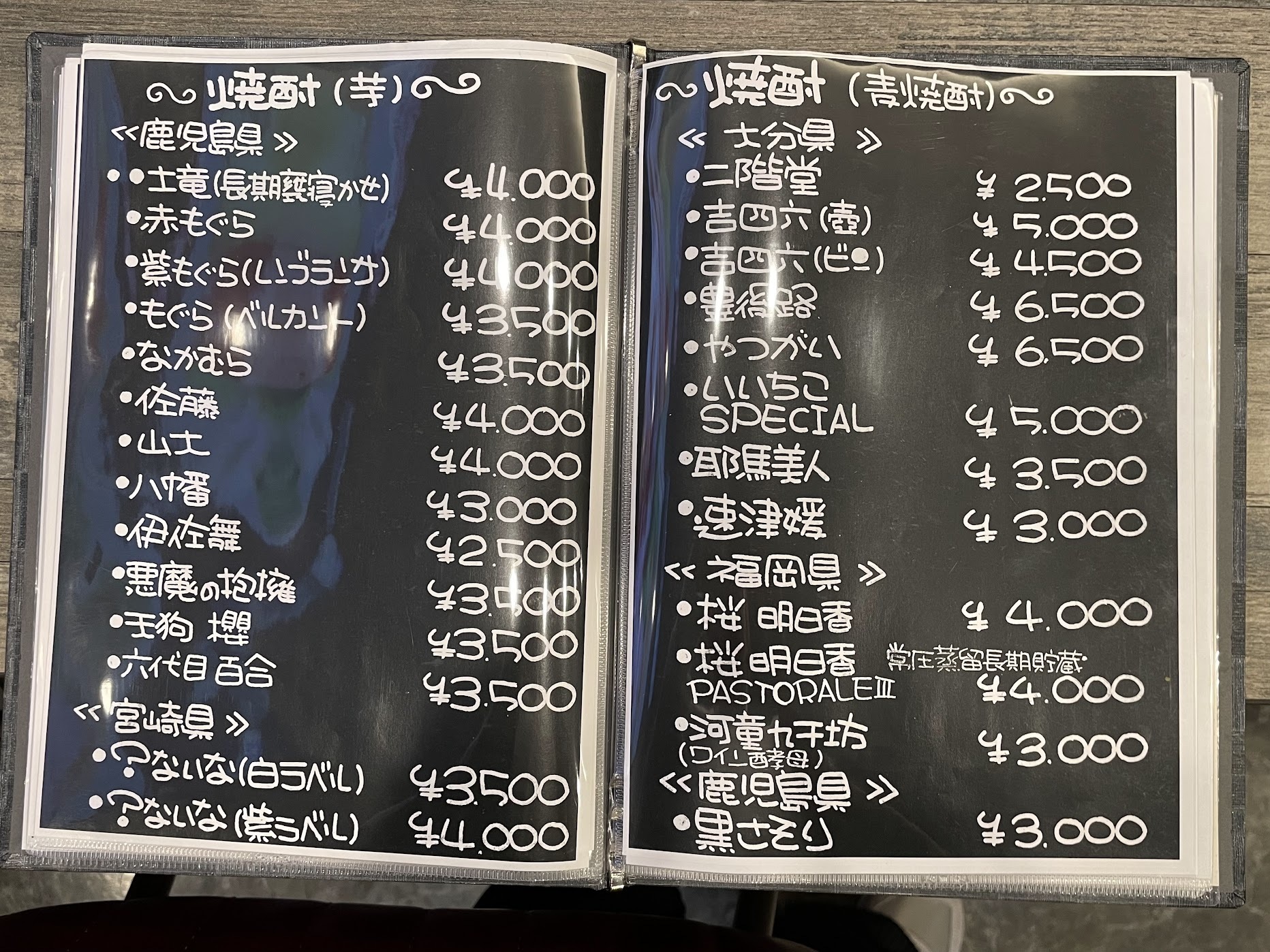 マスターとママが九州で買い付けてきた焼酎は、現在なんと約50種類。中には、プレミアム焼酎と銘され「3M」と言われる「魔王」・「村尾」・「森伊蔵」も! 貴重な「3M」が味わえるなんて、焼酎好きにはたまりませんね。