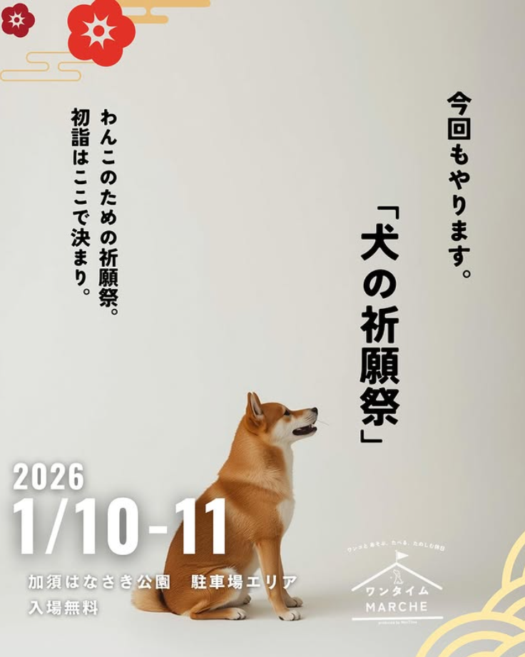 その名も「犬の祈願祭」。本格的な神事として宮司さん・巫女さんを呼び、“わんこのための専用祈願”を執り行います。毎年恒例となっている行事とのことですが、今回は限定の御守りや祈願グッズを販売するほか、お年玉キャンペーンも開催予定です。