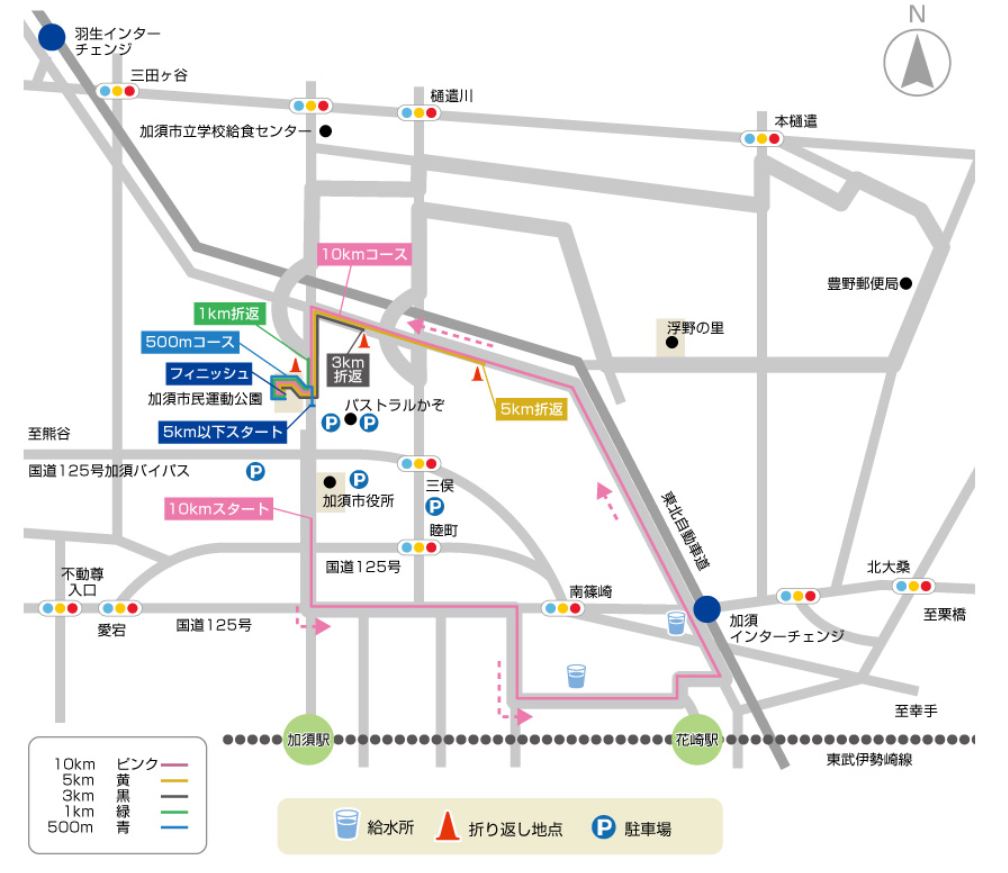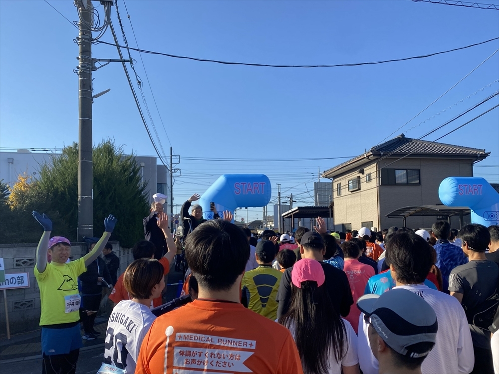 ゼッケンや参加賞、計測タグ(今回はゼッケンと一体型)は事前に自宅へ郵送されますので、当日の受付は不要です。トイレを済ませて、10キロのスタート地点である加須市役所付近に向かいます。