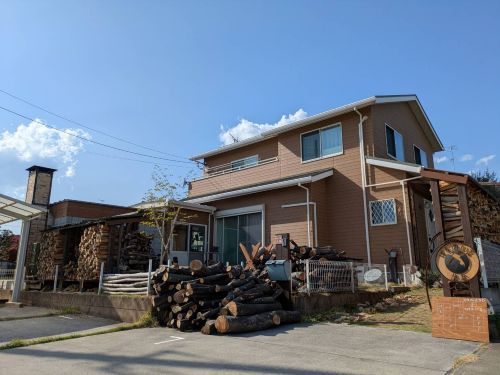 煉瓦造りの煙突と大きな薪棚がある家が見えてきます。