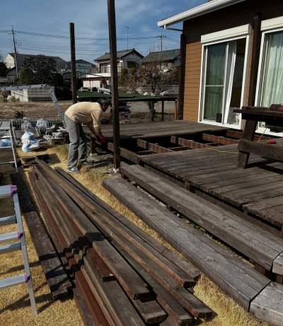 ウッドデッキを夫婦で解体し薪窯を作る準備。