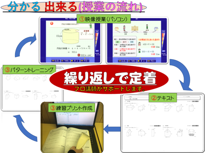 映像授業+繰り返し(プリント)+プロ講師のサポート
