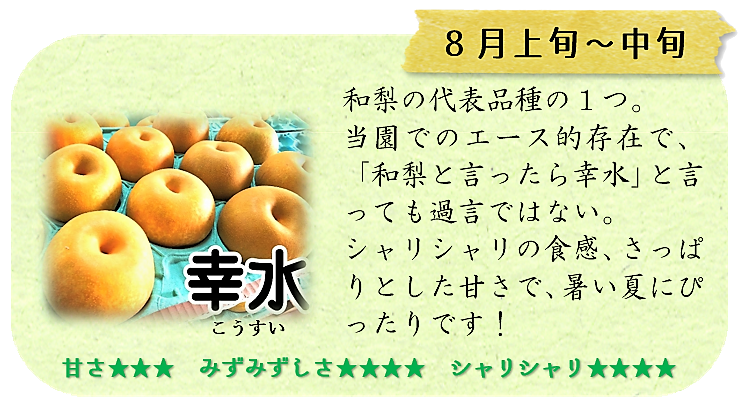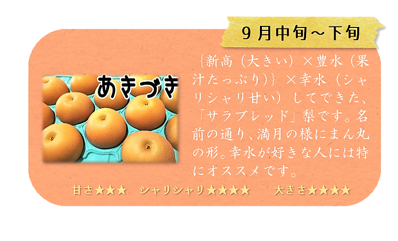 5種類の梨を1つ1つ大切に栽培しています。種類によって食感や甘さなどに特徴がありますのでぜひ食べ比べてみてください!